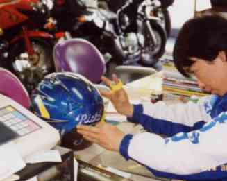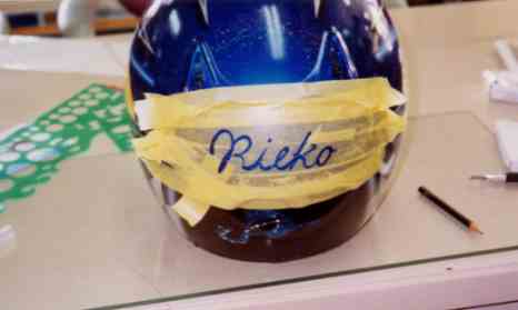 あいたスペースにネームを入れる。マスキングテープをしわにならないように貼り、そこにデザイン文字を書き、デザインナイフで切り取り、ブラシで吹きます。